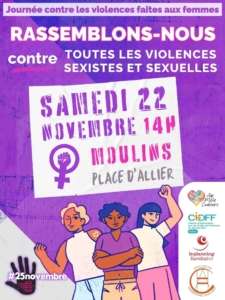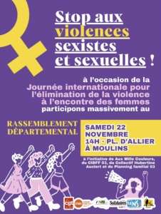 • Journée internationale de lutte contre les violences faites aux femmes, ce sera le 22/11 14h à Moulins.