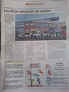 Suite à la conférence de presse de ce jeudi 11 décembre, la Montagne dans l’Allier consacre une page aux AESH, que nous reproduisons ci-dessous, et reviendra sur ce sujet dans son édition en ligne de demain. Cette place prise par la question des AESH, comprise par la presse locale comme ce qu’elle est : absolument centrale, montre qu’on ne peut plus l’esquiver. Donc, que ministère, recteurs et Dasen vont avoir de plus en plus de mal à l’esquiver !