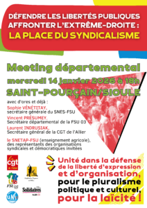 Ce meeting répondra aux menaces de l’extrême droite envers le syndicalisme dans notre département pour avoir contesté les subventions publiques accordées au spectacle « Murmures de la Cité ». Interviendront notamment Sophie Vénétitay, responsable nationale du SNES-FSU, Laurent Indrudiak pour la CGT, les co-secrétaires nationaux du SNETAP-FSU (enseignement agricole), et Vincent Présumey pour la FSU Allier.