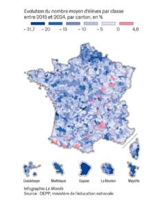 Quant à la démographie, répétons le : elle a bon dos quand les effectifs réels des élèves par classes augmentent. La carte ci-dessous provient du ministère. On peut y constater la hausse de ceux-ci, dans les écoles du bocage bourbonnais, en 2014-2025. La baisse de la natalité est générale, mais les hausses d’effectifs pas classes concernent les zones rurales ayant accumulé des fermetures. Là, il semble bien y avoir un rapport !