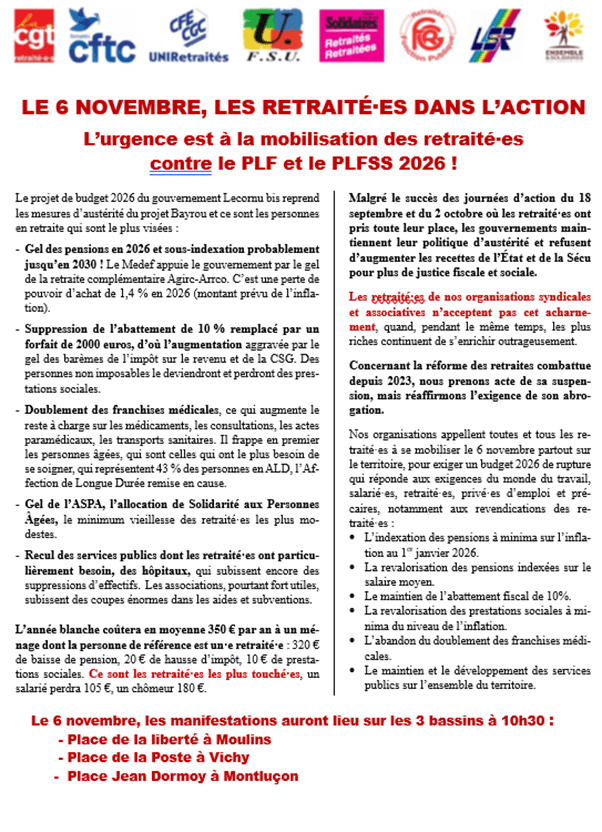 Le 6 novembre, les organisations syndicales et associations de retraités appellent à manifester ! 10h 30 à Moulins, place de la Liberté, Montluçon, Place Jean Dormoy, Vichy, Place de la Poste. Les retraités sont attaqués depuis le début dans le projet de budget "Bayrou" : gel des minimas sociaux, suppressions de l'abattement fiscal de 10%. Depuis, il a été question de leur faire payer la suspension partielle de la [...]