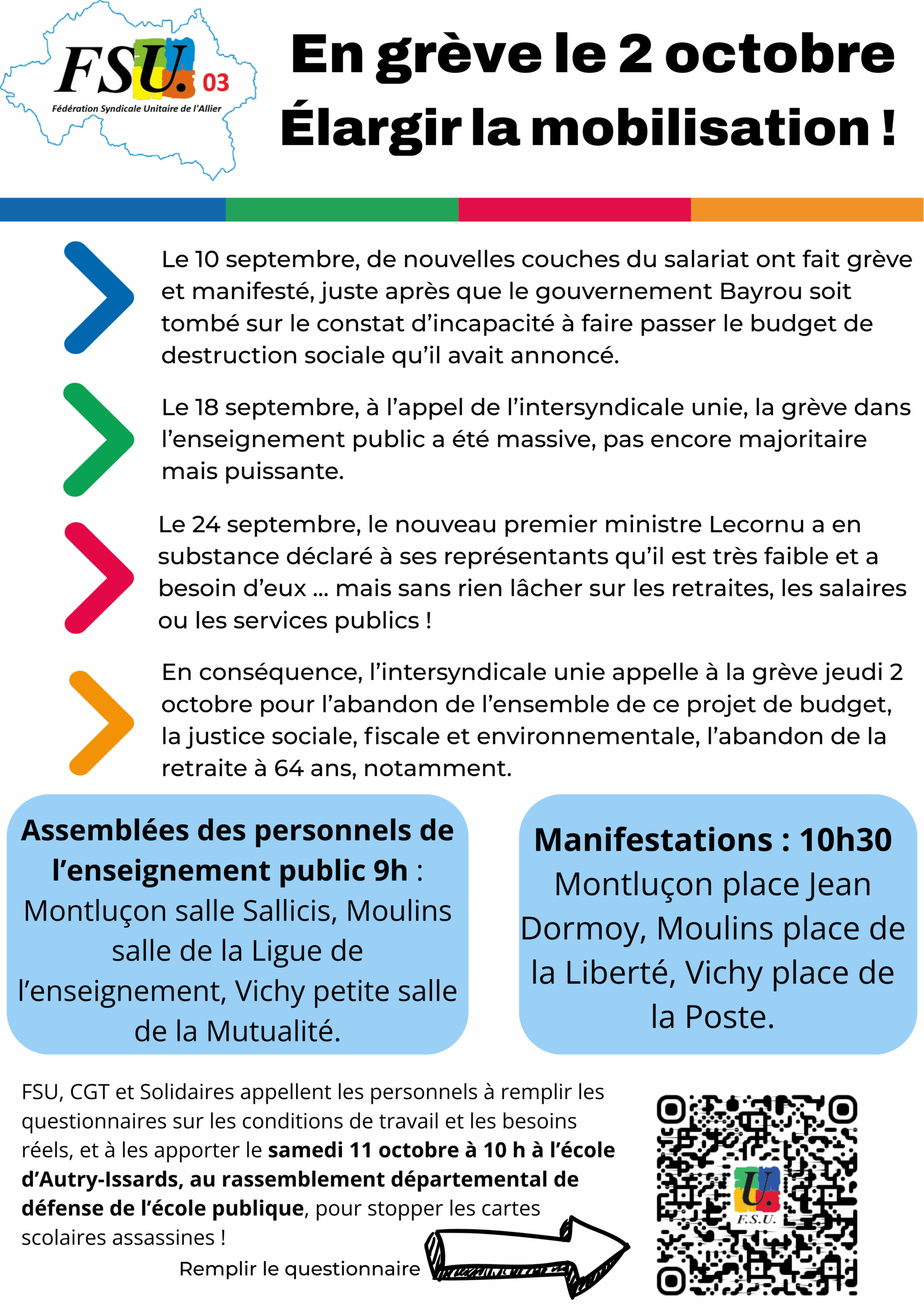 Conférence de presse " spéciale AESH" Mardi 7 octobre 2025 à 14h Etant donné le grand nombre de questions non résolues, le manque de 70 AESH, les problèmes évidents d'organisation entre le rectorat et la DSDEN, la FSU organise une conférence de presse le mardi 7 octobre devant la DSDEN de l'Allier à 14h. Soutenez-nous et rejoignez-nous ! Si vous souhaitez venir mardi et pour nous contacter Tél : 06 79 61 68 40 - Mail : fsu03@fsu.fr