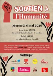 Mercredi 6 mai : « Murmures de la Cité » attaque « l’Humanité » en justice ! audience à Moulins 14h. 2026-04-30T18:11:34+02:0030 avril 2026|Catégories : À LA UNE| RASSEMBLEMENT 13 H MOULINS DEVANT LE TRIBUNAL JUDICIAIRE. TEMPS D’ECHANGE ET DE REFLEXION 18 H SALLE DES FETES DE CHEMILLY. Partagez cet article ! FacebookXWhatsAppTelegramEmail Articles similaires « Commençons peut-être par interdire la lecture de Germinal dans les écoles », déblatère l’UIMM ! « Commençons peut-être par interdire la lecture de Germinal dans les écoles », déblatère l’UIMM ! 23 avril 2026 Relevé de décisions et communiqué du Comité départemental de défense des écoles publiques : journée départementale de défense des écoles, collèges et lycées lundi 18 mai. Relevé de décisions et communiqué du Comité départemental de défense des écoles publiques : journée départementale de défense des écoles, collèges et lycées lundi 18 mai. 23 avril 2026 Buxières-Ygrande : les gens comprennent parfaitement. Buxières-Ygrande : les gens comprennent parfaitement. 20 avril 2026 Communiqué de la FSU Allier : mercredi 22, la démocratie est à Tronget. Communiqué de la FSU Allier : mercredi 22, la démocratie est à Tronget. 20 avril 2026 Courrier de la FSU 03 aux maires de l’Allier. Courrier de la FSU 03 aux maires de l’Allier. 19 avril 2026