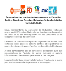 • Radon, écoles de Montluçon : communiqué des représentants du personnel.