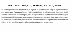 « Autrefois », les années précédentes, le nombre d’AESH pouvait augmenter pendant l’année … car il le fallait bien. Et il le faudrait encore plus cette année : on en est déjà à 85 enfants notifiés comme devant être accompagnés et qui ne le sont pas !
